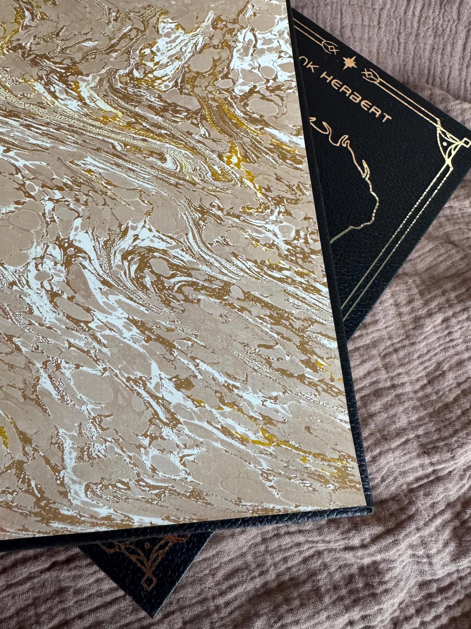 - End pages made from handmade parisian marble paper with gold shimmering details