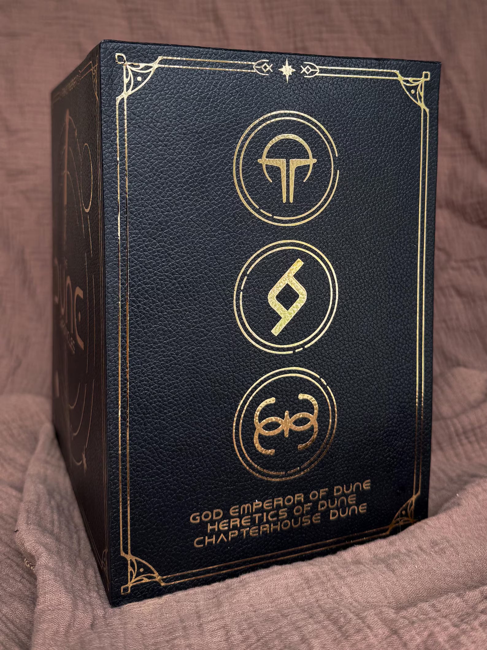 If you want a different color or material for the set you can send me a message! Disclaimer: Each book is custom made to order, please note that while I try my very best to deliver the finest quality, please be aware that minor imperfections may occur during the production process that will only add to the books uniqueness. Please also note that color may differ slightly from how it appears on your screen due to varying monitor settings or simple changes in the production of the printing. I do not own the rights to the book itself! All rights reserved to Randomhouse LLC and Frank Herbert